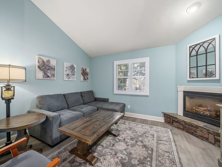 Designed for a peaceful escape or romantic retreat, this cozy room features a spacious king bed and a glowing fireplace that sets the mood for unwinding.