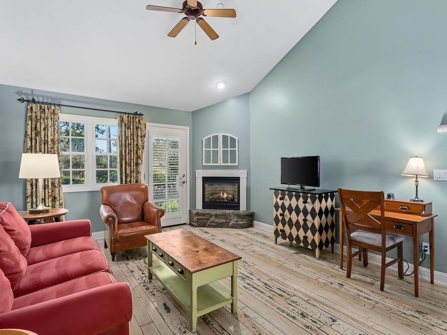 Set within a charming cottage-style suite, this elegant retreat offers a luxurious king bed, fireplaces in both the bedroom and living room, and a private patio perfect for quiet moments outdoors. Sleeps up to two guests.